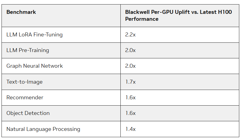 Os novos aceleradores têm desempenho de pico aproximadamente 2,27 vezes maior nos cálculos FP8, FP16, BF16 e TF32 do que os sistemas H100 de última geração. O B200 apresentou desempenho 2,2 vezes melhor ao ajustar o modelo Llama 2 70B e duas vezes o desempenho ao pré-treinar o modelo GPT-3 175B. Para sistemas de recomendação e geração de imagens, o aumento foi de 64% e 62%, respectivamente.