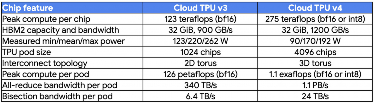 Segundo a empresa, um cluster TPU v4 tem um desempenho de mais de 1 Eflops. É verdade, neste caso estamos falando de cálculos BF16 ou INT8. Um acelerador de nuvem TPU v4 equipado com 32 GB de memória HBM2 (1,2 TB/s) produz até 275 Tflops neste modo, consumindo em média 170 watts. Agora, a empresa está ocupada instalando esses clusters em seus próprios data centers, e a energia de muitos deles será 90% fornecida por fontes “verdes” livres de carbono.