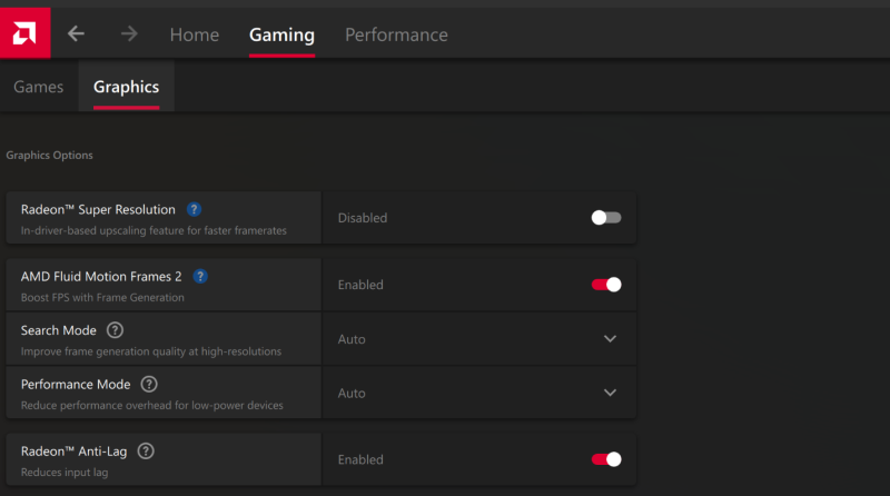 A AMD compartilhou exemplos de testes de benchmark com AFMF2 e VGM habilitados em combinação com FSR como parte do HYPR-RX. Os testes foram realizados nos gráficos integrados Radeon 890M do processador Ryzen AI 9 370HX com TDP de 28 W no laptop Asus Zenbook S16. Na resolução 1080p e usando FSR, a combinação das tecnologias AFMF2 e VGM pode atingir 90 fps em jogos como Far Cry 6, Horizon Zero Dawn Complete Edition, F1 23 e Marvel’s Guardians of the Galaxy.