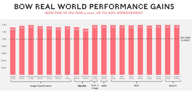 Como resultado, a empresa conseguiu aumentar ainda mais a frequência e o desempenho do BOW sem recorrer a retrabalhar o processador principal ou transferi-lo para uma tecnologia de processo mais fina e cara. Se a IPU original da segunda geração tinha um desempenho máximo de 250 Tflops, agora estamos falando de 350 Tflops – para um sistema BOW-2000 com quatro chips, 1,4 Pflops de desempenho total é declarado. E este é um bom ganho obtido sem custos críticos.