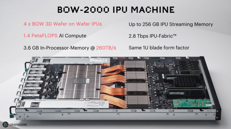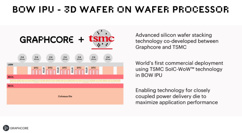 O novo chip, chamado BOW, pode ser condicionalmente referido como “geração 2.5”. Ele usa um chip Colossus Mk2 de segunda geração: 892 MB SRAM em 1472 blocos capazes de executar 8832 threads simultaneamente. Esta matriz ainda é fabricada usando o processo de 7 nm da TSMC, mas a Graphcore agora mudou para uma embalagem 3D Wafer-on-Wafer (3D WoW) mais avançada.