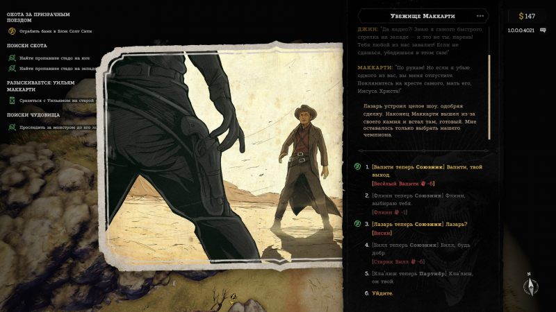 Na história principal e nas missões secundárias, bifurcações morais aparecem de vez em quando, a escolha em que afetará a simpatia de um ou outro personagem por Jin. Por exemplo, quando surge um dilema – como lidar com um criminoso que tem um jackpot na cabeça, se seus motivos parecem mais nobres do que aqueles que prometem uma recompensa. Nós atiramos – e Flynn ficará feliz, leve-o vivo – e Lazarus se tornará um pouco mais solidário conosco, e se o deixarmos ir para casa, então o Velho Bill, cuja história em grande parte ecoa o destino desse bandido, queira ou não, vai notar.