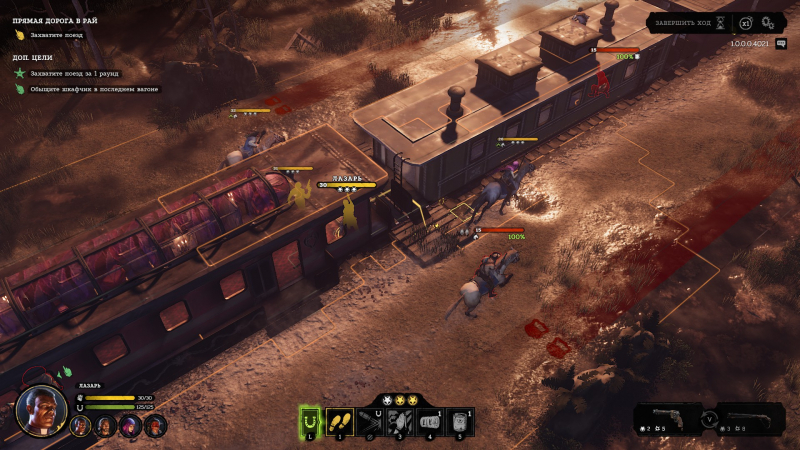 Uma variedade de inimigos adiciona coragem às escaramuças táticas, forçando você a se adaptar à situação e procurar a melhor solução. As condições especiais de algumas batalhas também contribuem para isso – por exemplo, um limite de tempo (os fãs de XCOM 2 agora estremecem), a necessidade de sair do tiroteio sem perder ou, digamos, ter tempo para levar toda a equipe a um certa área. E muitas vezes opcionais são adicionados às condições principais, que prometem um bom bônus material no final da tarefa (uma arma, um mapa ou um valioso item consumível). Mas, infelizmente, também acontece que, em vez de condições ou restrições especiais, o jogador decide simplesmente tomar banho de inimigos. E especialmente desagradável é a superioridade numérica do inimigo nas condições de combate em vagões de trem. Nesses espaços estreitos de dois andares com muitos obstáculos, o próprio diabo quebrará a perna na tentativa de definir um ângulo de câmera conveniente e se orientar na batalha. Felizmente, esses incidentes desagradáveis na dança de batalha de Hard West 2 são a exceção e não a regra.
