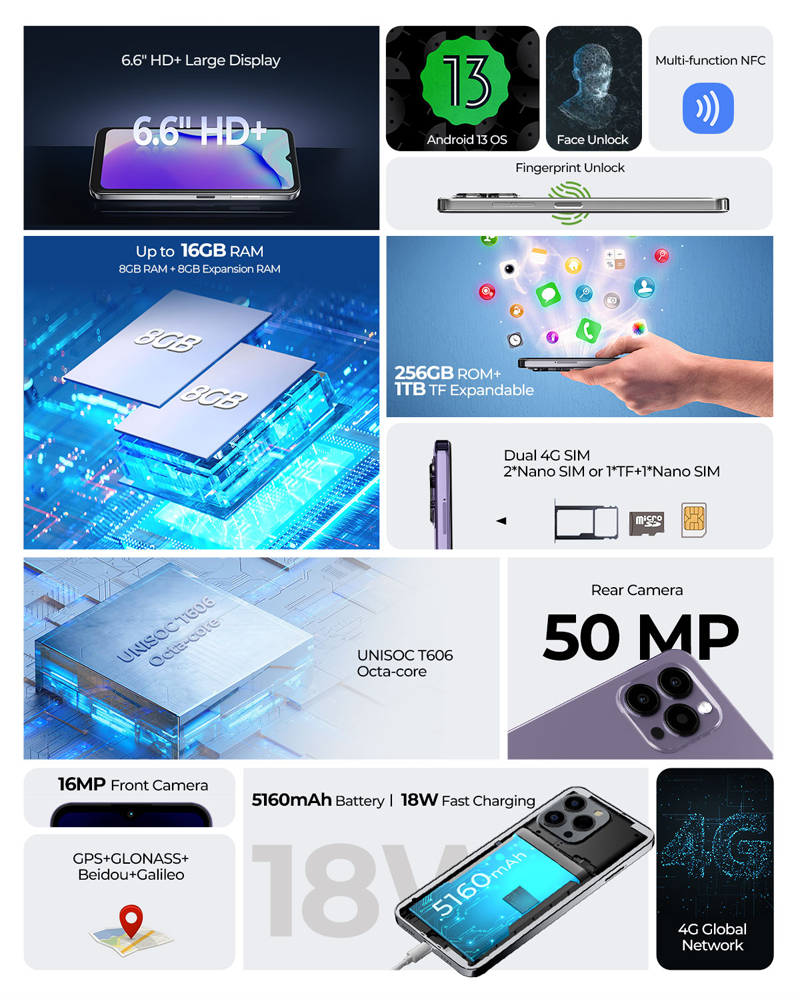 HOTWAV Note 13 Pro é equipado com um processador Unisoc T606 de núcleo octa que oferece desempenho suave e sem atrasos para todas as suas tarefas diárias. Graças aos 8 GB de RAM com possibilidade de expansão virtual até 16 GB e ao pen drive de 256 GB, além de slot para cartões de memória microSD de até 1 TB, o usuário terá espaço suficiente para instalar aplicativos, bem como armazene fotos, vídeos e arquivos diversos.