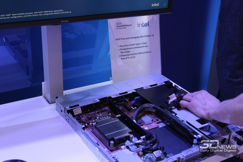 O servidor é baseado na plataforma de hardware Intel Xeon 6 SoC (Granite Rapids-D), otimizada especificamente para dispositivos de rede e periféricos. O indicador TDP varia de 110 a 235 W, a frequência turbo ao usar todos os núcleos atinge 2,9 GHz. O modelo ProLiant Compute DL110 Gen12 é implementado em um formato 1U. As características completas do sistema ainda não foram divulgadas. A funcionalidade de sincronização de tempo GNSS diretamente na placa-mãe e as ferramentas de gerenciamento HPE iLO 7 são mencionadas.