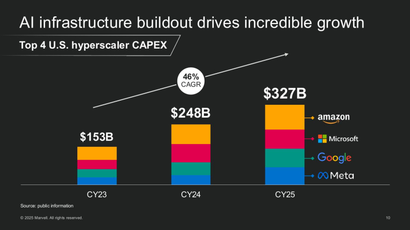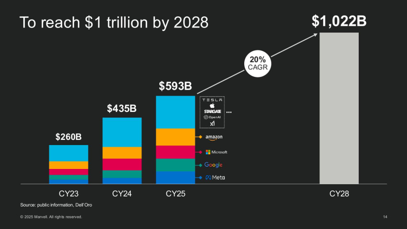 Murphy descreveu como os gastos globais de capital para data centers dispararam, impulsionados pela ascensão dos hiperescaladores e da IA soberana. Os principais hiperescaladores dos EUA — AWS, Microsoft, Google e Meta✴ — aumentaram seus gastos de capital combinados de US$ 150 bilhões em 2023 para mais de US$ 300 bilhões em 2025. Globalmente, a projeção é de que os gastos ultrapassem US$ 1 trilhão até 2028. A Marvell acredita que uma parcela significativa desses gastos será direcionada para plataformas de semicondutores personalizadas.