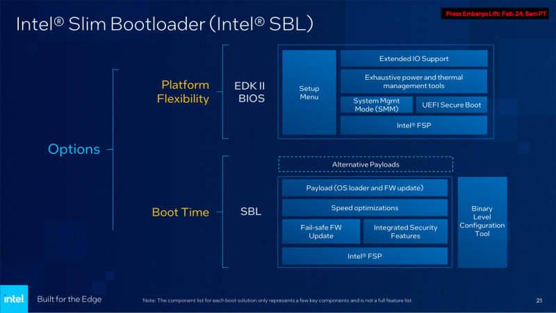 Em geral, a parte “nuclear” dos novos Xeon-Ds ainda é a mesma arquitetura Ice Lake-SP. Assim, a Intel mais uma vez lembrou sobre o suporte DL Boost / VNNI para trabalhar com formatos de baixa precisão e a capacidade de executar cargas de inferência com eficiência – os novos produtos são quase 2,5 vezes superiores ao Xeon D-1600. Existem outras funções padrão da plataforma, como PFR ou SST. Das adições importantes, pode-se destacar o suporte ao Intel Slim BootLoader.