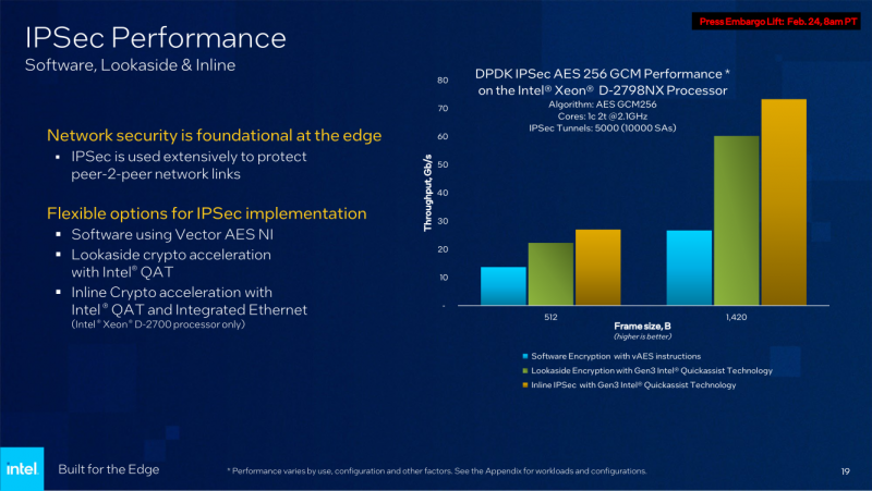 Mas o QAT também pode trabalhar em conjunto com a CPU (offload do lado de fora), ou você pode ficar sem ele usando o AES-NI. O suporte total para enclaves de computação SGX seguros também ajuda a oferecer suporte à segurança, limitando significativamente os vetores de ataque do sistema operacional e do software e do hipervisor da máquina virtual. Isso é importante porque o nível de ameaça é geralmente mais alto na borda do que em um ambiente controlado no data center, mas a modificação do software é necessária para usar o SGX.