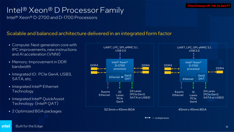 A escalabilidade da nova plataforma se estende de 2 a 10 (D-1700) ou 20 (D-2700) núcleos, e o TDP é de 25-90 e 65-129 W, respectivamente. Dependendo do modelo, a operação é suportada em uma faixa de temperatura estendida (até -40 ° C). Ambas as opções têm embalagem BGA, mas com dimensões ligeiramente diferentes – 45 × 45 mm versus 45 × 52,5 mm. As diferenças não param por aí. O suporte de memória Xeon D-1700 mais recente é limitado a três canais DDR4-2933, mas o D-2700 possui quatro canais DDR4-3200 completos.