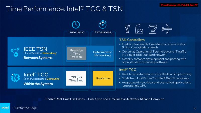 O último ponto foi implementado anteriormente nos processadores da série Atom x6000E, Xeon W-1100E e alguns processadores Core de 11ª geração. Em suma, trata-se de uma tecnologia que permite coordenar cálculos com precisão inferior a 200 µs no modo TCC devido à sincronização precisa dos tempos dentro da plataforma. E aqui o Xeon D, como um SoC altamente integrado, tem uma vantagem na implementação dessa classe de precisão. Isso também é ajudado pela presença de um agendador especial para o cache L3 compartilhado, que permite um acesso mais consistente ao cache e à memória.