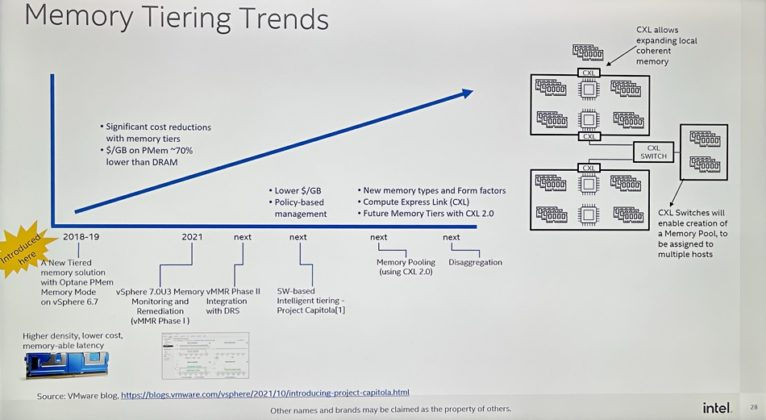 Atualmente, a maior parte das soluções Optane são produtos de segunda geração codinomes Alder Stream (SSD) e Barlow Pass (módulos PMem), mas no evento Storage Field Day, um representante da Intel falou sobre a prontidão da empresa em anunciar a terceira geração, o principal característica distintiva dos quais será o suporte para CXL e pools de memória hierárquica.