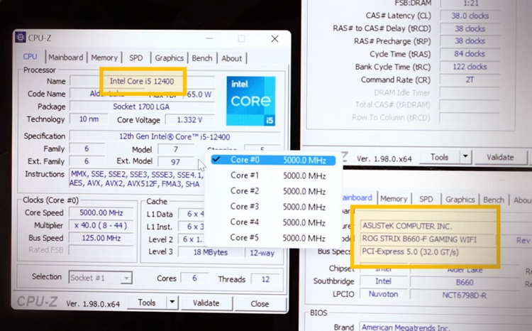 Após o overclock do Core i5-12400 para 5 GHz em todos os seis núcleos, o nível de desempenho do chip ficou próximo ao do Ryzen 7 5800X de oito núcleos no teste Cinebnech R20. De acordo com Der8auer, um Core i5 com overclock em uma placa com um Intel B660 se comporta da mesma maneira que quando com overclock em placas com um chipset Intel Z690 – ele mostra uma temperatura de pico de 93 graus Celsius com um consumo de energia de 117 watts.