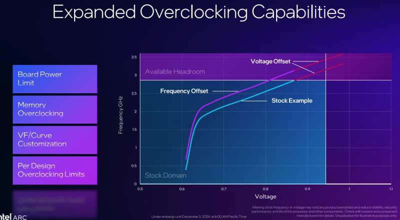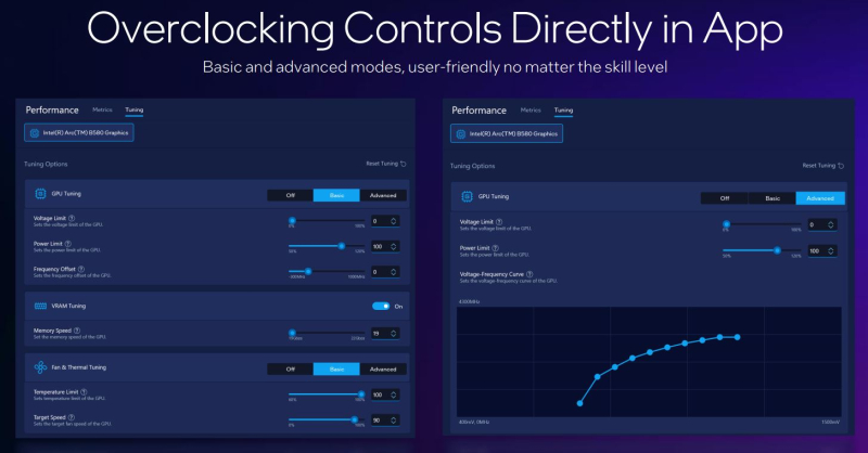 O novo aplicativo oferece opções de overclock mais avançadas para placas gráficas Intel em comparação com Arc Software. Por exemplo, tornou-se possível fazer overclock na memória de vídeo. De acordo com os dados fornecidos, a velocidade da memória de 19 Gbps por pino pode ser aumentada para 22 Gbps por pino. Além disso, você pode configurar os parâmetros de consumo de energia da placa de vídeo, tensão de operação e frequência da GPU.