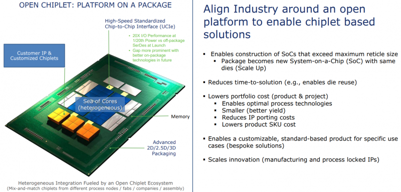 Mas o uso de tecnologias proprietárias limita significativamente o potencial das soluções de chiplet e, em março deste ano, 10 grandes desenvolvedores, incluindo AMD, Qualcomm, TSMC, Arm e Samsung, fundaram o novo padrão Universal Chiplet Interconnect Express (UCIe) para superar essa limitação .