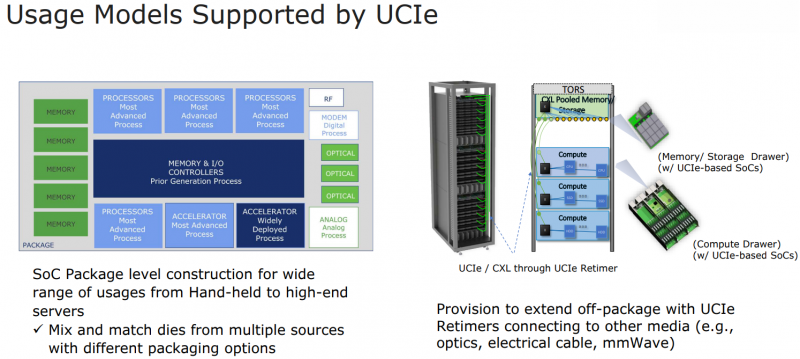 A Intel está muito interessada no novo padrão, que planeja usar UCIe de forma que na próxima geração de processadores, núcleos x86 possam coexistir com Arm ou RISC-V. Ao mesmo tempo, está planejado garantir a compatibilidade UCIe com as tecnologias de empacotamento Intel EMIB e TSMC CoWoS, ao mesmo tempo adicionando suporte para outros barramentos, incluindo Arm AMBA, bem como a capacidade de converter facilmente para protocolos proprietários de outros desenvolvedores.