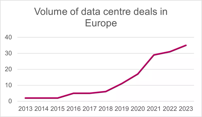 Ao mesmo tempo, a actividade no domínio dos centros de dados na Europa está a crescer. A participação dos investimentos nesta região passou de 6% em 2022 para 20% em 2023. Assim, cerca de 7,2 mil milhões de dólares foram investidos em centros de dados europeus durante o ano passado. Além disso, o volume de transações no mercado de centros de dados está a crescer constantemente na Europa.