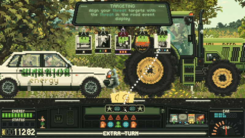 Por exemplo, você se depara com um trator na estrada: grande, barulhento e não há como contorná-lo. Este é um dos eventos de estrada e, no início dele, ícones de ameaça aparecem na parte inferior da tela. Eles são inofensivos por si só, mas se houver um ponto de exclamação acima de um deles, significa que após sua vez o “oponente” causará dano a você. E isso vai depender de quais ícones o jogo escolheu como atacantes – ou seja, ou seu carro será danificado ou o tanque de gasolina estará um pouco vazio. Normalmente, nem todos os ícones se tornam perigosos imediatamente, mas em alguns eventos (por exemplo, ao encontrar um policial), todos eles podem ser ativados desde o primeiro segundo.