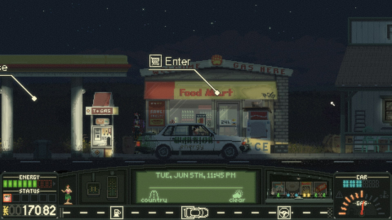 Você pode influenciar bônus e penalidades, inclusive com a ajuda de consumíveis, que são vendidos livremente em todas as lojas. O personagem está com fome – você compra uma barra de chocolate ou uma banana. Ele sentiu frio depois de passar a noite em um carro em vez de em um motel – você bebe café fresco. E se você quiser levar, é melhor comprar uma garrafa térmica junto, senão a bebida vai esfriar. Não menos importantes são as atualizações para o carro, que estão disponíveis em quase todas as lojas, mas só podem ser instaladas em oficinas. Com eles, ainda mais bônus aparecem: com um volante moderno, o personagem quase nunca sentirá estresse, com um bom carburador, uma das ameaças em cada evento é imediatamente destruída, a grade aumenta a resistência do carro. Sem mencionar os vários tipos de pneus que também afetam as ameaças ou melhoram o desempenho. E uma suspensão de qualidade duplica o efeito dos pneus, o que o incentiva a abordar sua escolha com sabedoria.
