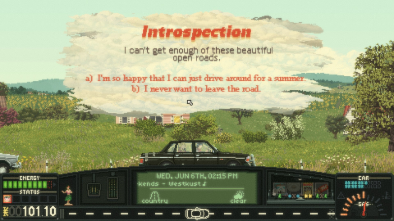 O jogo inteiro é construído sobre essas “lutas” de cartas, e elas são variadas o suficiente para não se tornarem entediantes muito rápido – até mesmo os animais que você encontra na estrada são diferentes, e você tem que lidar com ovelhas e corvos do seu próprio jeito. Alguns dos problemas que o personagem enfrenta parecem artificiais, mas, no geral, a mecânica de jogo em Keep Driving é tão incomum que você rapidamente para de prestar atenção nela. Em vez disso, você explora as complexidades que não são abordadas no tutorial, como bônus temporários passivos para personagens. Se ele não dormir por muito tempo, será imposta uma penalidade na reserva máxima de energia. Se a “batalha” for muito bem-sucedida, o humor do herói aumentará e na próxima “luta” as cartas que normalmente custam energia ficarão gratuitas.