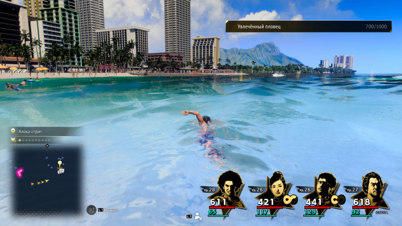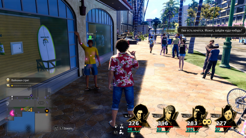 Tudo isso será útil tanto ao percorrer a história quanto ao explorar o mundo aberto – e é incrivelmente rico aqui. O sistema de progressão é projetado de tal forma que tanto Honolulu quanto Yokohama crescem com mais e mais entretenimento a cada capítulo. No início, basta caminhar e coletar objetos brilhantes, inclusive malas com consumíveis. Aí você instala o aplicativo Aloha Connections e, enquanto caminha pelas ruas de Honolulu, acena para os transeuntes, fazendo amigos virtuais. Aí você baixa uma paródia local do Tinder, trabalha como entregador em um minigame parecido com Crazy Taxi, fotografa atrações, participa de uma caça fotográfica para exibicionistas, vai pescar – a lista é enorme. Sem falar nas inúmeras tarefas paralelas: ou você fará o papel de dublê, ou ajudará um turista perdido, ou conseguirá um emprego como garçom.