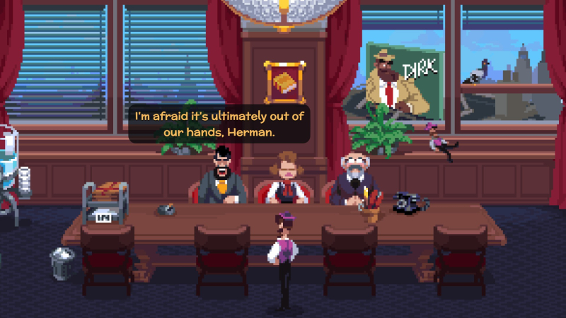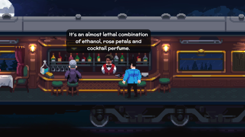 Em primeiro lugar, você se apaixona pelo jogo por causa de seu estilo visual – tanto o ambiente é maravilhosamente desenhado quanto os personagens são lindamente animados. O lado visual foi tratado por um artista que já trabalhou na Chucklefish em Wargroove e Starbound, e seu profissionalismo é óbvio. Todos os personagens, mesmo os menores, revelaram-se muito animados: alguém levanta o pincenê quando se assusta, o cabelo de alguém “salta” quando se mexe. Às vezes você tem a sensação de que há até sincronização labial aqui – parece estranho no caso de um jogo de pixel, mas quando você percebe isso, é difícil parar de prestar atenção. Como cada personagem recebeu muita atenção – até mesmo para os visitantes anônimos do cassino que se alegram com suas vitórias – você se apega aos personagens e não se importa em gastar tempo conversando com eles repetidamente em busca de uma solução para o próximo enigma. .