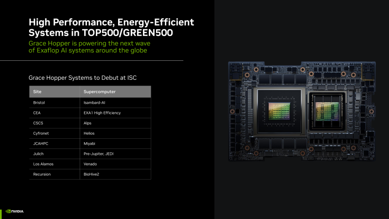 A lista de sistemas da plataforma Grace Hopper também inclui Júpiter, o primeiro supercomputador europeu em exaescala. O complexo estará localizado no Centro de Pesquisa Jülich (FZJ), na Alemanha. Além disso, a lista inclui o complexo DeltaAI baseado no GH200 Grace Hopper, que está sendo desenvolvido pelo Centro Nacional de Aplicações de Supercomputação (NCSA) da Universidade de Illinois em Urbana-Champaign (EUA).