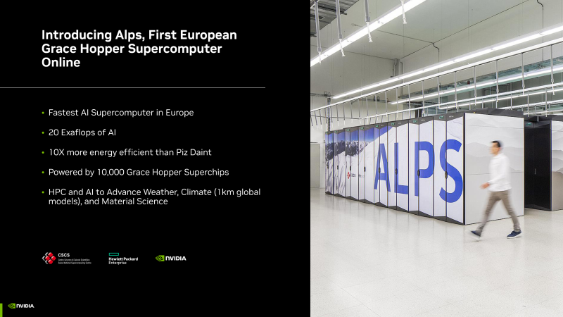 Outro sistema foi o supercomputador Alps do Swiss National Computer Center (CSCS). Utiliza um total de 10 mil superchips Grace Hopper. O desempenho reivindicado da IA atinge 10 Eflops, tornando-o o supercomputador de IA mais rápido da Europa. Diz-se que o Alps é 10 vezes mais eficiente em termos energéticos do que o sistema Piz Daint da geração anterior.
