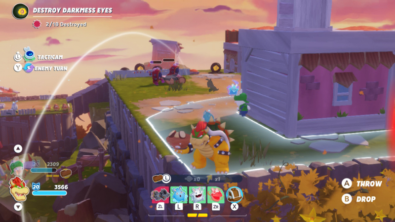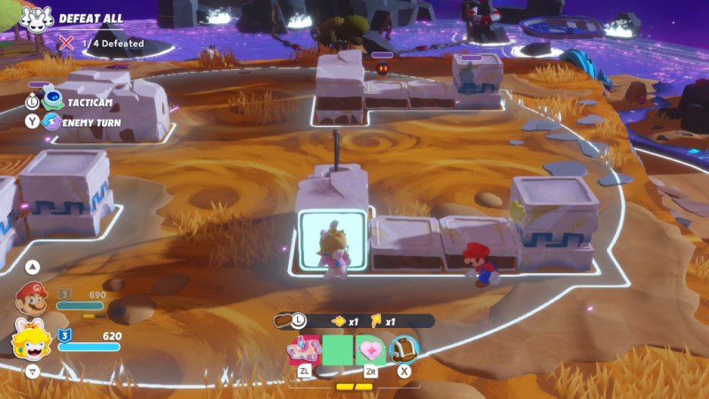 O sistema de combate recebeu as mudanças mais perceptíveis. As batalhas em Kingdom Battle foram medidas, enquanto Sparks of Hope se tornou muito mais dinâmico e variado. Os lutadores ganharam mobilidade devido ao abandono da grade nas arenas – os heróis podem correr livremente dentro de sua zona de movimento, sem restrições quanto ao número de passos, como, por exemplo, em Valkyria Chronicles. Sim, e a troca de personagens no mesmo turno ainda é permitida infinitamente, o que abre muito espaço para todos os tipos de combinações e manobras táticas. É verdade que deve-se ter em mente que desta vez é impossível se mover após um tiro da arma principal, por isso é melhor se esconder atrás de algo antes da salva.