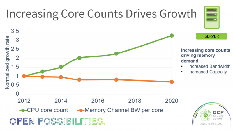 Portanto, nos últimos anos, o preço da DRAM de 1 Gbit parou de cair significativamente, de modo que a memória está se tornando um componente cada vez mais caro em um servidor. E não só do ponto de vista financeiro, mas também em termos de consumo de energia, o que afeta negativamente o custo total de propriedade (TCO). Além disso, o desempenho do processador melhorou significativamente, principalmente devido a um aumento no número de núcleos (mais de três vezes). No entanto, a largura de banda da memória por canal apenas dobrou em média e quase caiu pela metade em termos de núcleo.