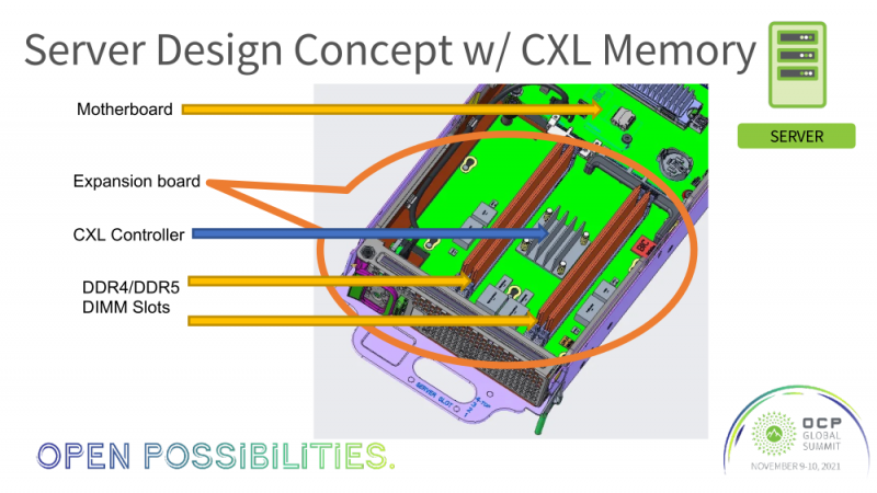 O protótipo usa um servidor com uma amostra de engenharia Intel Xeon Sapphire Rapids e uma placa de expansão padrão para a plataforma Yosemite v3. A placa com conexão x16 PCIe 5.0 carrega a bordo uma versão de engenharia do FPGA (provavelmente algo da série Agilex) com dois controladores de memória e dois slots DIMM para DDR4 regular registrado com um volume total de 64 GB. Com base em FPGA, a interface CXL 2.0 é implementada, a qual oferece suporte para o protocolo CXL.memory e fornece recursos avançados de monitoramento e depuração.