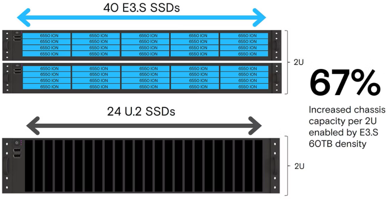 O 6550 ION é adequado para criar data lakes para IA, para ingestão, preparação de dados e criação de pontos de verificação durante o treinamento, para armazenamento de arquivos e objetos, criação de armazenamento em nuvem pública, manutenção de bancos de dados analíticos, bem como para sistemas de entrega de conteúdo. O 6550 ION também oferece densidades de armazenamento líderes do setor, permitindo que os clientes reduzam a área ocupada pelo data center em até 67%, ao mesmo tempo que oferece densidades tão baixas quanto 1,2 PB/1U.