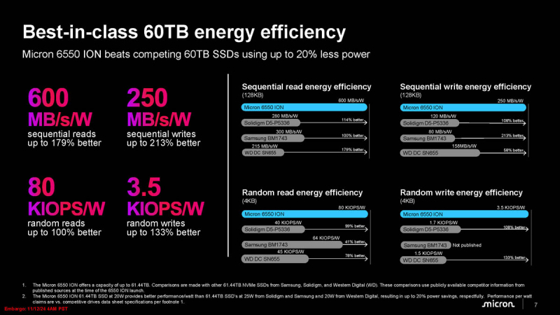 A nuance é que o Micron 6550 ION mais rápido está justamente com essa combinação de capacidade, formato e interface, e a comparação é feita com soluções da Samsung, Solidigm e Western Digital, mas não da Kioxia. O consumo típico de energia de novos produtos não excede 20 W. Um dos modelos da Western Digital tem exatamente o mesmo valor, mas a solução da Micron é mais rápida. O 6550 ION é compatível com OCP 2.5 e possui Active Power Management (ASPM). Isso permite que o inversor consuma 4 W no modo de espera no estado L1 versus 5 W no estado L0, o que aumenta a eficiência energética quando ocioso em até 20%.