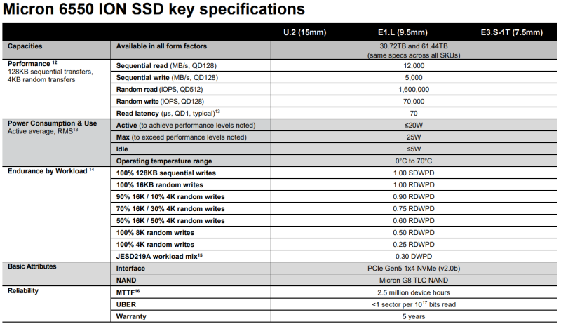O Micron 6550 ION está disponível nos formatos E3.S (1T), U.2 e E1.L e tem capacidade de 30,72 ou 61,44 TB. Além disso, diz-se que o 6550 ION oferece um conjunto de recursos de segurança líderes do setor, incluindo SPDM 1.2 para atestado e SHA-512 para geração segura de assinaturas. É compatível com TAA e certificado FIPS 140-3 L2.