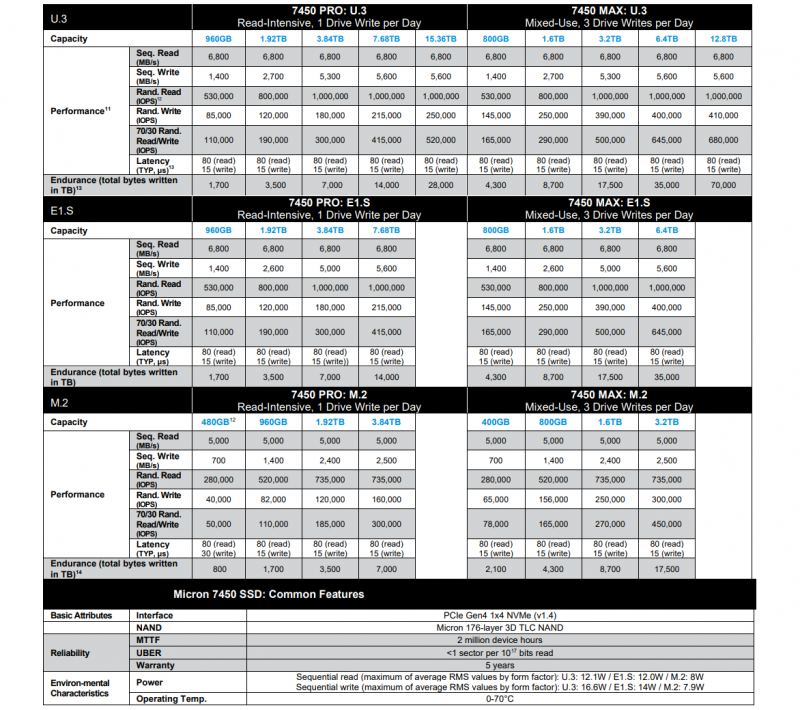 Apenas alguns meses após o lançamento dos SSDs de classe empresarial Micron 7400 (PCIe 4.0), a Micron revelou seus sucessores na série 7450, que apresentam menor latência, velocidades mais rápidas e capacidades mais altas, embora venham nos mesmos fatores de forma : M.2, U.3 e E1.S. A nova série também inclui as versões 7450 Max e 7450 Pro.