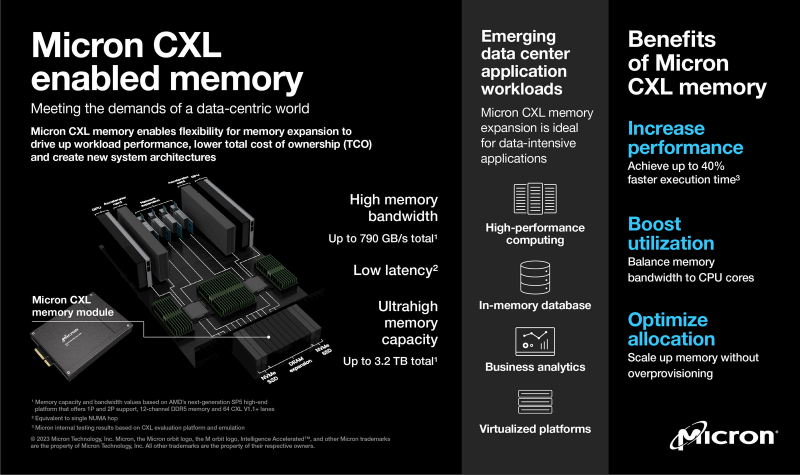 A Micron Technology anunciou a disponibilidade dos primeiros lotes de módulos de expansão de memória CXL CZ120 para seus parceiros. Os novos módulos atendem ao padrão CXL 2.0 Tipo 3 e possuem uma arquitetura de canal duplo. Eles são fabricados no formato E3.S 2T (PCI Express 5.0 x8) e estão disponíveis em capacidades de 128 e 256 GB.