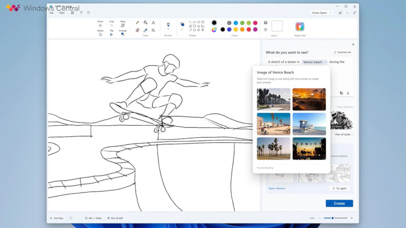 Segundo a fonte, o gerador de imagens será baseado na mesma rede neural utilizada pela plataforma Bing Image Creator – ela cria imagens a partir de descrições de texto dos usuários. O recurso também publicou um layout proposto internamente da interface Paint atualizada com recursos de IA.
