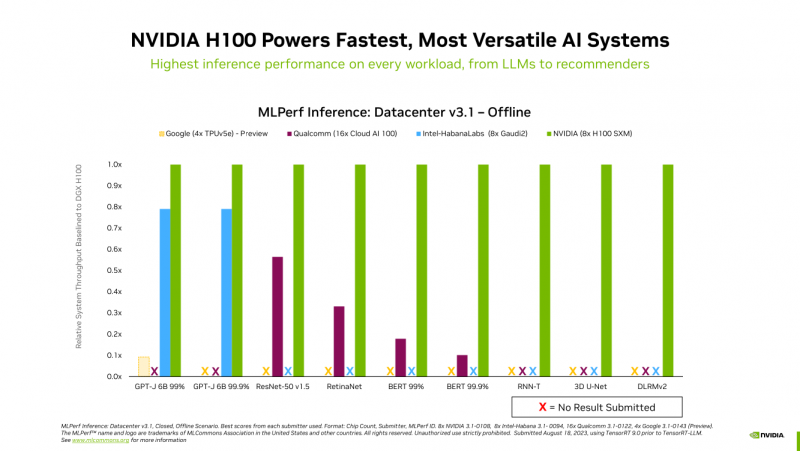 A NVIDIA anunciou anteriormente os recordes H100 no novo benchmark MLPerf. Agora diz-se que o superchip GH200 Grace Hopper passou em todos os testes MLPerf pela primeira vez. No entanto, os sistemas equipados com oito aceleradores H100 forneceram o maior rendimento em todos os testes de inferência MLPerf. As soluções NVIDIA concluíram o teste de recomendação atualizado (DLRM-DCNv2) e também concluíram o primeiro benchmark GPT-J – LLM com 6 bilhões de parâmetros.