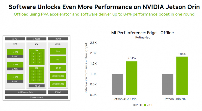 Observa-se também que os módulos NVIDIA Jetson Orin, graças ao novo software, apresentaram um aumento de desempenho de até 84% em tarefas de detecção de objetos em comparação com a rodada anterior de testes MLPerf. A aceleração ocorreu graças ao uso do Programmable Vision Accelerator (PVA), um mecanismo separado para processamento de imagens e algoritmos de visão computacional operando independentemente da CPU e GPU.