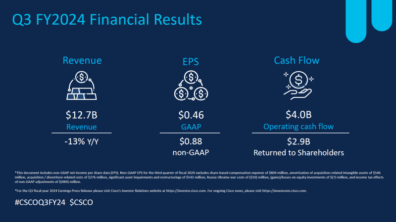 O fornecedor americano de equipamentos de rede de classe empresarial Cisco relatou resultados para o terceiro trimestre do ano fiscal de 2024, que terminou em 27 de abril. As vendas da empresa caíram 15%, para 7,37 mil milhões de dólares, nas Américas, 9%, para 3,46 mil milhões de dólares, na Europa, Médio Oriente e África (EMEA), e 12%, para 1,87 mil milhões de dólares, na região Ásia-Pacífico, Japão e China (APJC). A receita caiu 13% em relação ao ano anterior, para US$ 12,7 bilhões, a maior queda desde 2009.