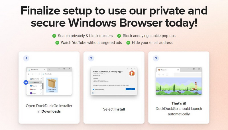 O DuckDuckGo difere de outros navegadores por não coletar ou transferir dados do usuário para terceiros por padrão. O desenvolvedor relata que o navegador usa cerca de 60% menos tráfego em comparação com o mesmo Google Chrome. Quando você entra em qualquer site, o DuckDuckGo bloqueia o rastreamento de geolocalização, criptografa a maior parte do seu tráfego, desativa todos os serviços de rastreamento e oculta anúncios intrusivos, bem como espaços de página vazios em sites onde os anúncios de banner foram localizados anteriormente. Ele também possui um gerenciador de senhas integrado. No futuro, será adicionado suporte para várias extensões ao navegador DuckDuckGo.