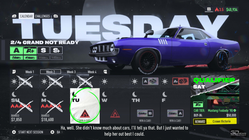 Além disso, a maioria das corridas exige uma taxa de inscrição – por exemplo, você investe três mil dólares e pode obter até doze para o primeiro lugar. Quanto mais baixa a colocação, pior o prêmio em dinheiro: quem ficou nas últimas posições geralmente pode ir para o vermelho. Com isso, você leva cada corrida muito mais a sério do que o normal, principalmente considerando a falta de retrocesso, como no Forza Horizon 5. Se você bater em alguém ou virar mal, pode se despedir de um bom prêmio. Devido ao número limitado de reinícios, às vezes você pensa – talvez deva aguentar o segundo ou terceiro lugar, pegar o dinheiro e ir mais longe? E se o resto das corridas daquele dia for ainda mais difícil ou você não tiver sorte?
