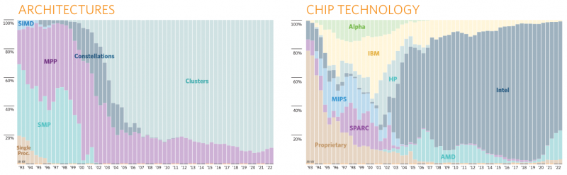 Leonardo é um sistema um tanto incomum. Foi anunciado há dois anos, então entre os novos sistemas top de classificação passou a ser o único baseado em Intel Xeon, enquanto os demais usam AMD EPYC e os aceleradores A100 da primeira onda, que já estão desatualizados até hoje. Leonardo empurrou para baixo todos os outros participantes do Top 10. Mas a China tem teimosamente ignorado o TOP500 desde o verão passado! E tem pelo menos dois sistemas da classe exaflop, OceanLight e Tianhe-3, e segundo a Hyperion Research, há evidências de que a China tem pelo menos cinco máquinas mais potentes que se encaixam no top 10.