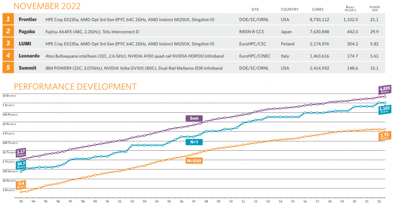 O supercomputador Frontier com desempenho de 1.102 Eflops permaneceu como líder da lista TOP500. O desempenho da máquina não melhorou, mas também não teve novos concorrentes oficiais. Além disso, a Frontier alcançou 7,94 eflops de precisão mista no benchmark HPL-MxP (anteriormente HPL-AI). Ao mesmo tempo, o supercomputador ainda está em fase de depuração e sofre com falhas.