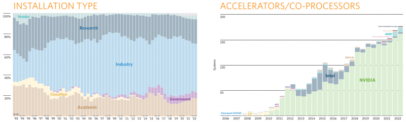 O limite mínimo para entrar na classificação aumentou para 1.729 Pflops. Caso contrário, não há mudanças significativas no rating. Por exemplo, a participação da Ethernet aumentou de 226 para 233 máquinas, enquanto a Infiniband diminuiu de 196 para 194. O Omnipath encolheu de 40 para 36 máquinas, e os sistemas com interconexões exóticas agora são 4 em vez de 6. A participação de sistemas baseados em processadores AMD continua a crescer, assim como o número de sistemas com aceleradores, que são representados principalmente por soluções NVIDIA.