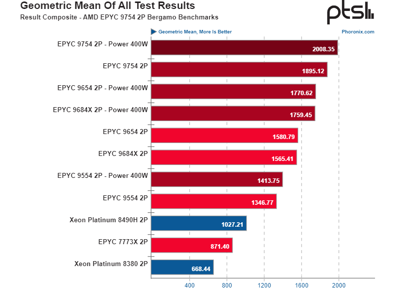 Nos mesmos testes, havia outro participante – EPYC 9754 (Bergamo). Em cargas atípicas para ele, ele ainda mostrou um resultado decente, mas 128 núcleos são 128 núcleos. Em mais um teste do Phoronix, ele superou todos os outros participantes com um ganho de 20% sobre o Genoa(-X) mais antigo em cargas de trabalho com bom paralelismo. Ao mesmo tempo, acabou sendo mais eficiente em termos de energia do que seus equivalentes com núcleos Zen4 e Intel Xeon.