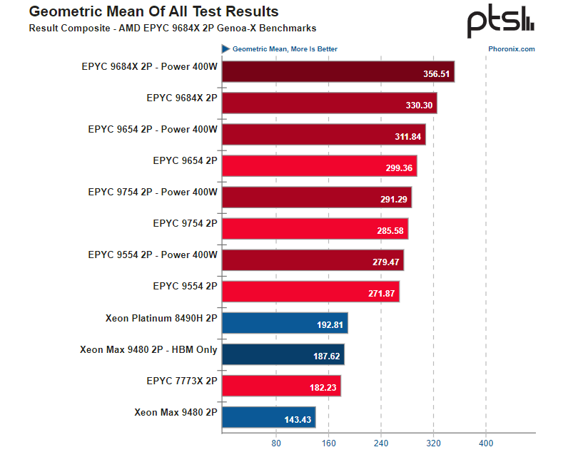 Portanto, de acordo com os testes da Phoronix, nos benchmarks de HPC e AI que o Genoa-X visa, o 9684X no modo padrão supera tanto o Genoa 9654 regular com limites “desligados” (cTDP 400 W) quanto o Milan-X (7773X) no modo padrão. ), e Xeon Sapphire Rapids (8490H) e Xeon Max (9480). Separadamente, há um aumento de desempenho em relação ao Milan-X, enquanto a diferença entre os chips é de menos de dois anos.