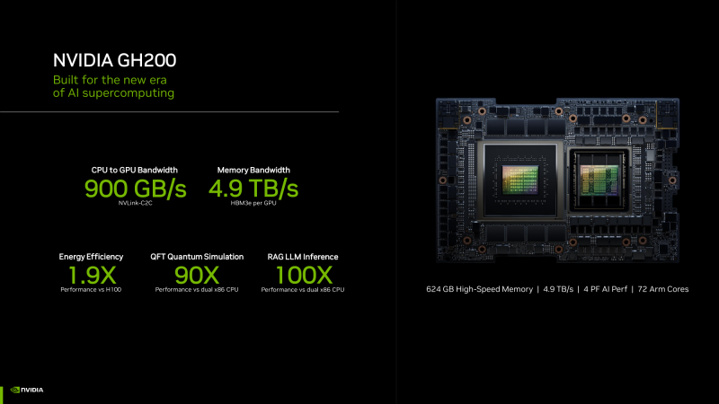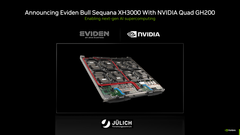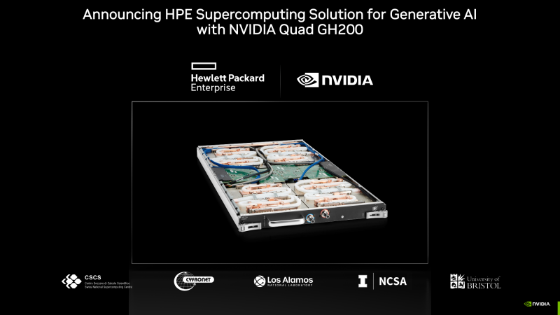 Ao mesmo tempo, a NVIDIA apresentou o “bloco de construção” básico para supercomputadores do futuro próximo – a placa Quad GH200 com quatro chips GH200, onde todos os aceleradores são conectados entre si via NVLink em um esquema each-to-each. No total, a placa carrega mais de 2 TB de memória, 288 núcleos Arm e tem desempenho FP8 de 16 Pflops. Os nós HPE Cray EX254n e Eviden Bull Sequana XH3000 são baseados no Quad GH200. Até o final de 2024, o desempenho total de IA dos sistemas com o GH200, segundo estimativas da NVIDIA, chegará a 200 Eflops.