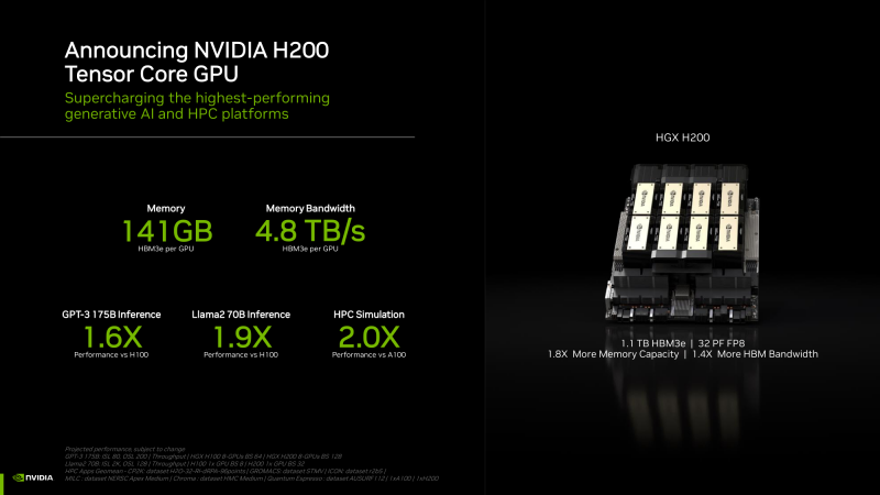 O H200 recebeu 141 GB de memória HBM3e com largura de banda total de 4,8 TB/s. O H100 tinha 80 GB HBM3 e a largura de banda era de 3,35 TB/s. Os aceleradores híbridos GH200, que incluem o H200, receberão até 480 GB LPDDR5x (512 GB/s) e 144 GB HBM3e (4,9 TB/s). Porém, há alguma confusão com o GH200, já que em um lugar a NVIDIA fala em 141 GB, e em outro cerca de 144 GB de HBM3e. A versão atualizada do GH200 estará amplamente disponível após o lançamento do H200, mas por enquanto a NVIDIA fornecerá a versão original de 96 GB com HBM3. Lembramos que o próximo concorrente AMD Instinct MI300X receberá 192 GB de memória HBM3 com largura de banda de 5,2 TB/s.