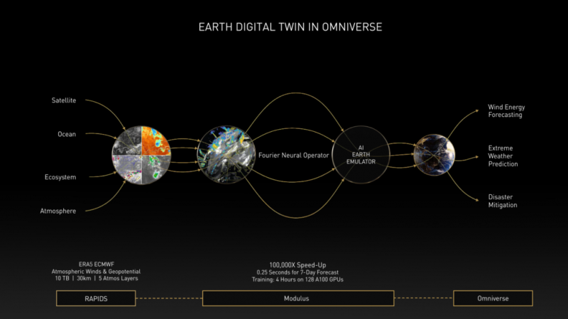 O CEO da NVIDIA, Jensen Huang, anunciou planos para criar um gêmeo digital da Terra usando a plataforma Omniverse. A empresa está construindo o supercomputador Earth-2. Será o equivalente a Cambridge-1, o supercomputador de IA mais poderoso do mundo para pesquisas médicas, mas apenas para modelagem de mudanças climáticas. O Earth-2 executará a estrutura Modulus AI, que permite criar modelos de IA para simular vários processos físicos.