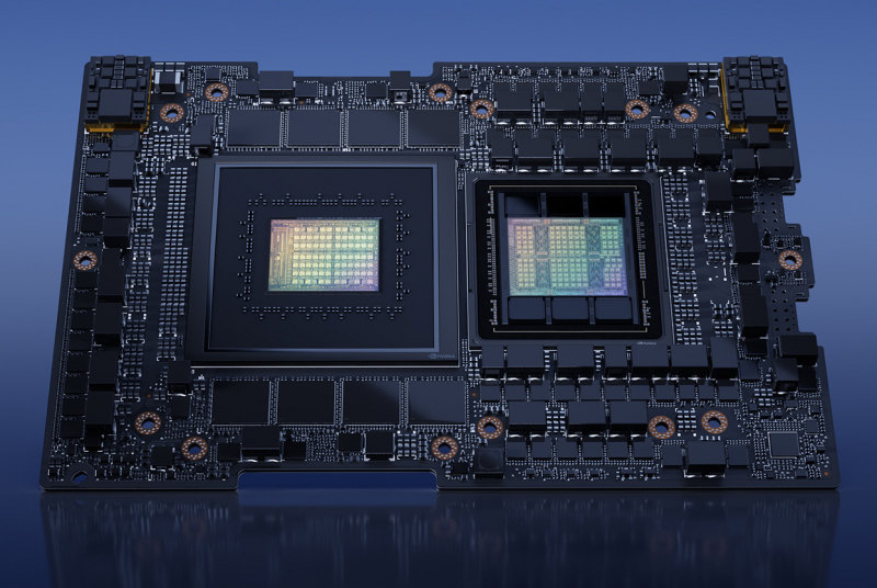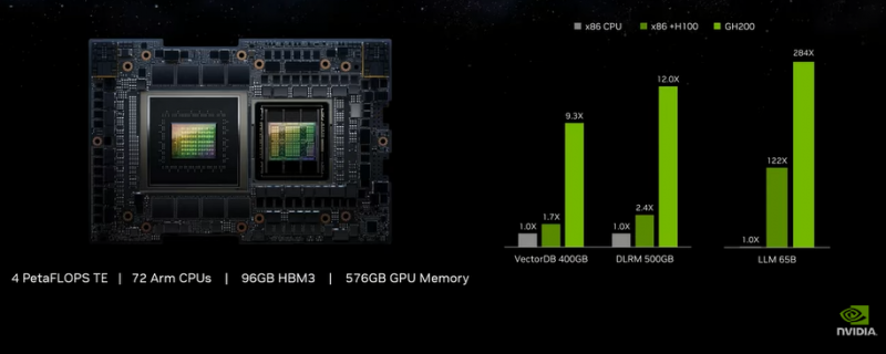 O Grace Hopper inclui um processador NVIDIA Grace Arm de 72 núcleos e um acelerador NVIDIA H100 com 96 GB HBM3. A quantidade total de memória LPDDR5 para ambos os cristais é de 576 GB. As matrizes são interconectadas pelo barramento NVLink-C2C, que fornece uma taxa de transferência de 900 GB / s: isso é aproximadamente sete vezes mais que o PCIe 5.0. O nível de desempenho declarado do GH200 é de 4 PFlops usando o Transformer Engine.